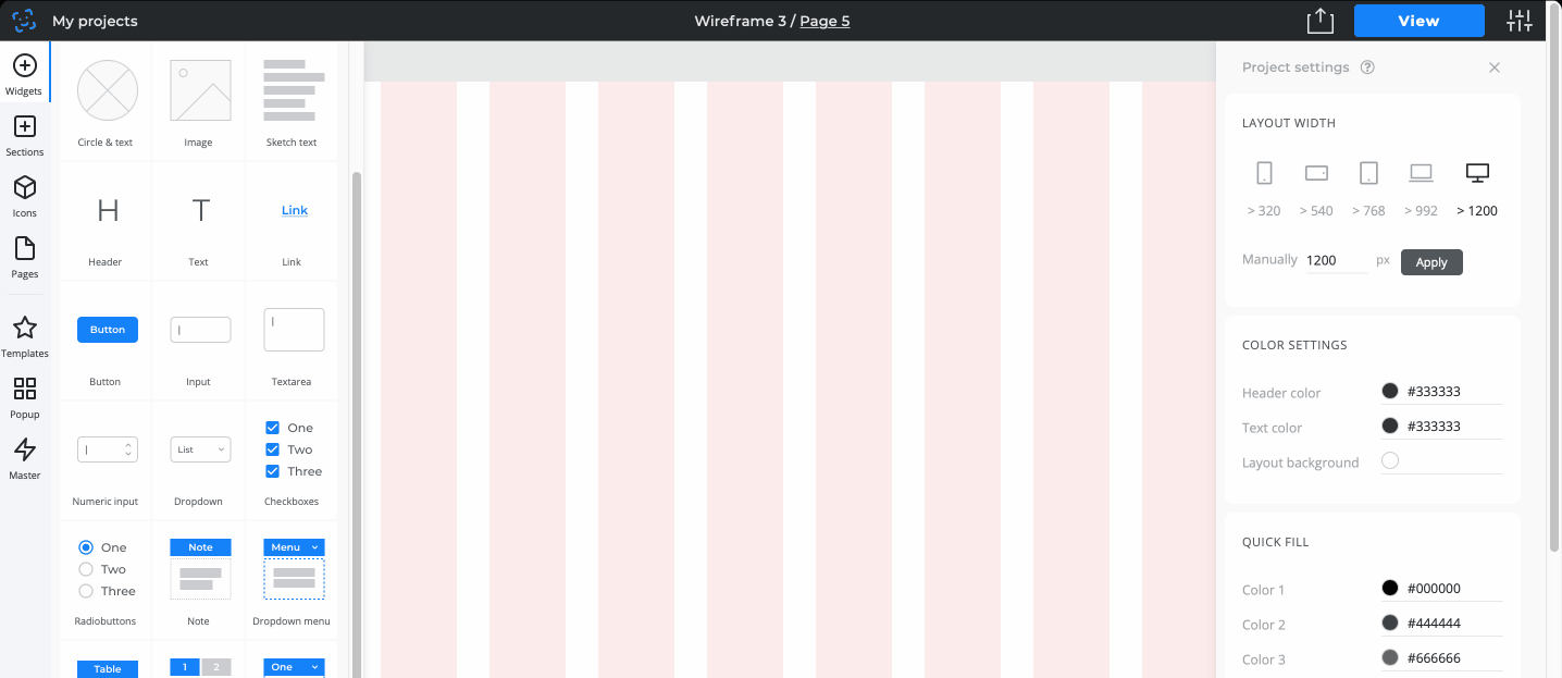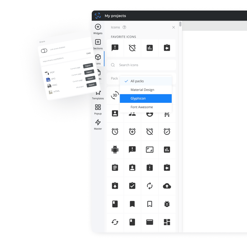 Create clickable site prototype, landing pages, interfaces. Share via link, PDF, and HTML.